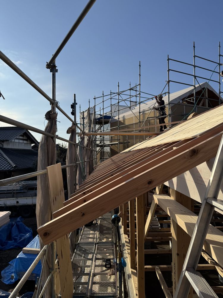 屋根面材が張り終わり、化粧垂木と屋根付加断熱材張り 天気予報を見ながら面で仕上げていっています