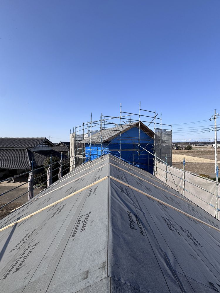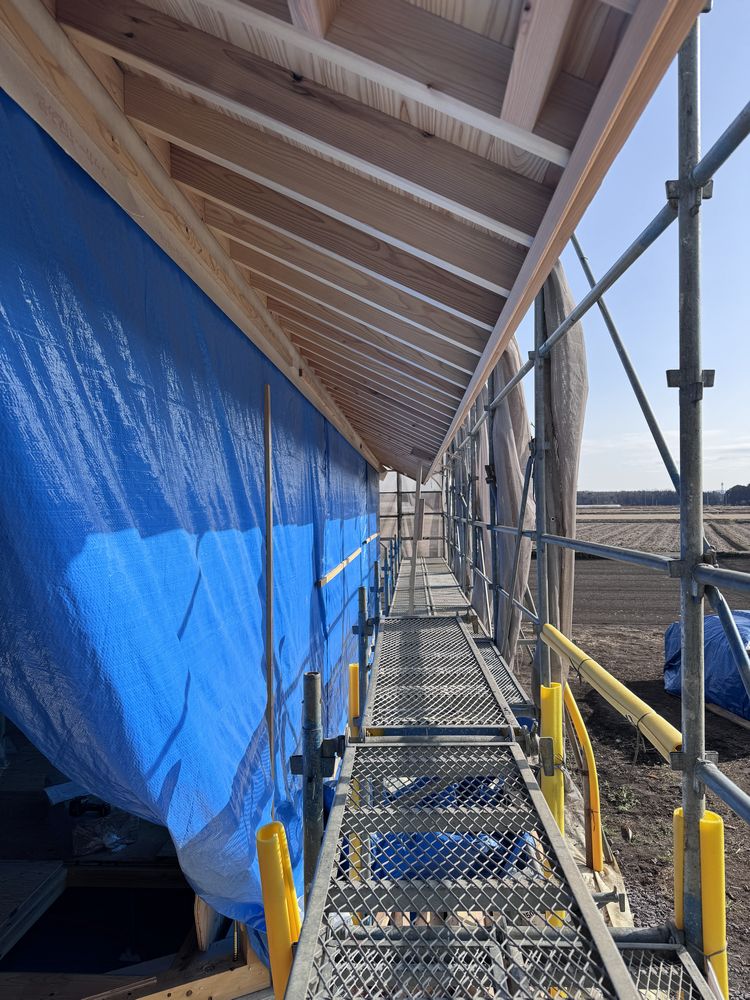屋根面材→化粧垂木→屋根付加断熱材→化粧野地板と野地板→ルーフィングが終わり屋根下地完了です